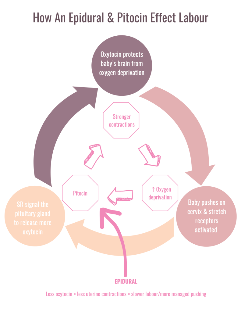 An epidural stops the pain signal of the stretch receptors from reaching the brain. The brain doesn’t send the signal to release more oxytocin. Without oxytocin, contractions slow down and labour stalls. Epidurals inhibit the mother from being able to move in an upright position which helps shift baby further into the pelvis. The baby also stops receiving the inhibitory signal to decrease brain activity which results in a decrease of brain protection.