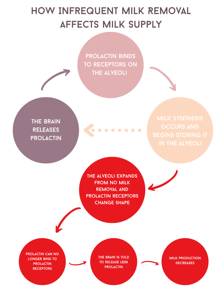 We are meant to remove this milk as frequently as baby needs it. If milk is not removed frequently enough, the alveoli sacs expand as they reach their maximum capacity. The receptors change shape inhibiting prolactin to bind. If the receptors don’t bind, and no further milk synthesis occurs. A signal is sent back to the brain that there was too much prolactin released and to release less next time. If this loop continues because milk is constantly being stored, rather than being removed, then milk supply continues to decrease.