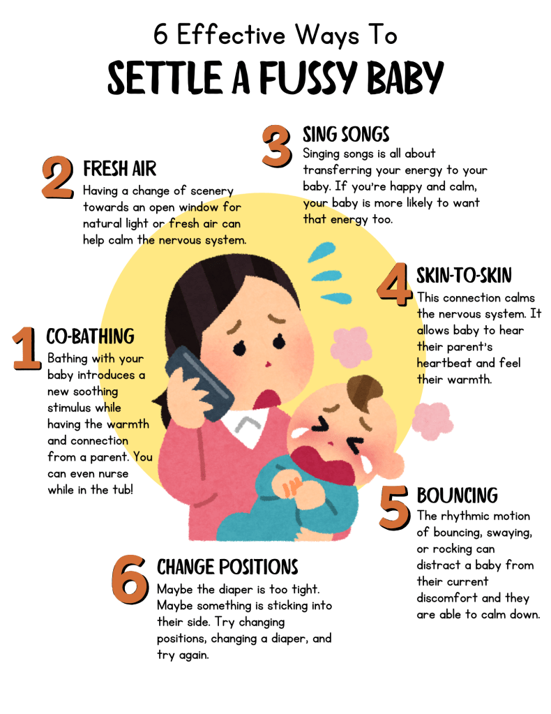 Some ways you can get through the witching hour if baby becomes fussy at the breast and switching and compressions no longer work is to go near an open window, get some fresh air, change a diaper, sing a song, bounce on a yoga ball, or take a warm bath together (not separate). After a few minutes and allowing baby to have a change in scenery or stimulus you can then resume breastfeeding and see if baby is willing to come to the breast again.